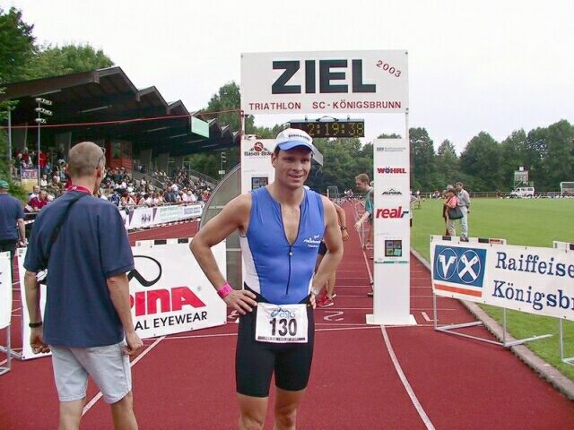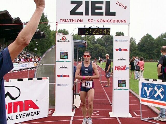Roland Werner im Ziel desKönigsbrunner Triathlons 2003