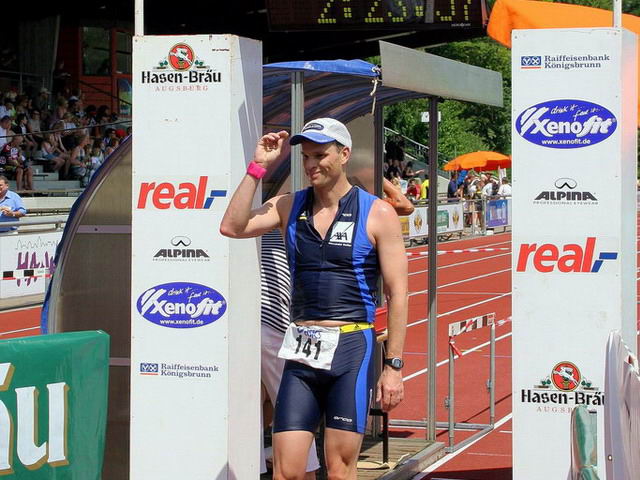 Roland Werner im Ziel beimTriathlon in Königsbrunn